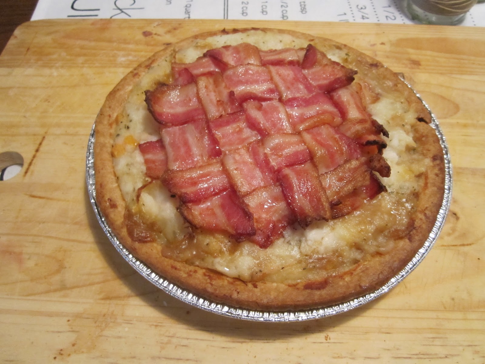 Once it's done (too your liking) take it out of the oven and let it rest/cool for a bit (I'd say like 30 minutes?) to let it settle and the bacon crisp. Unfortunately I didn't take in consideration that the bacon will shrink so it turned out like this instead of covering the whole pie but whatever, it's about the taste right?